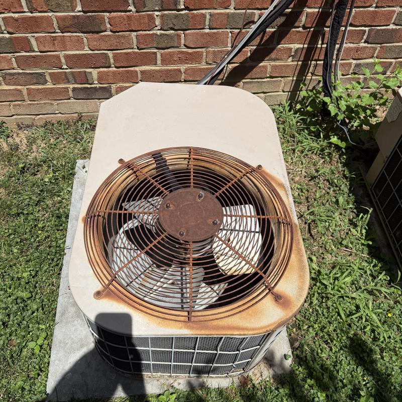 A technician in Fredericksburg, Virginia inspected two HVAC systems. One system had a failed capacitor, and the other had a non-working outdoor fan motor. The technician explained repair and replacement options to the customer.