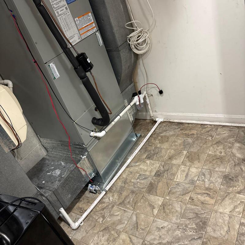 An HVAC technician in Mineral, VA corrected improper drainage from a sweating air handler in a crawlspace. The team leveled the unit with rubber pads, flushed the pan, line, and pump, and restored system function. A start assist kit was recommended to support compressor performance. The system was tested and covered with a 30-day limited warranty.