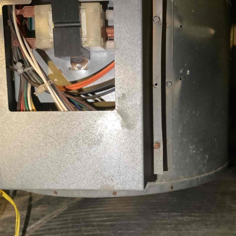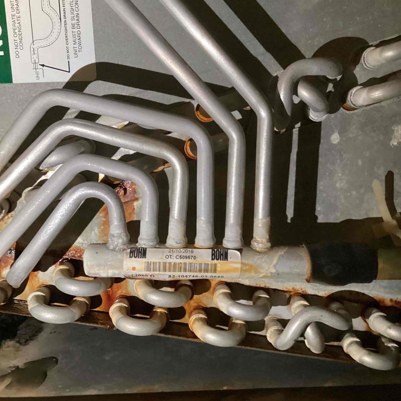 A technician inspected a home HVAC system in Locust Grove, VA after a no-cooling issue. They found a leaking indoor coil, low refrigerant pressure, biological growth in the air handler, and disconnected safety switches. They recommended a full system replacement and shared replacement options with the homeowner.