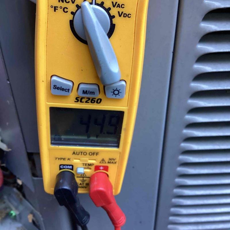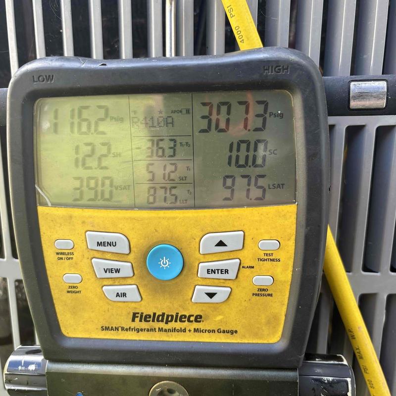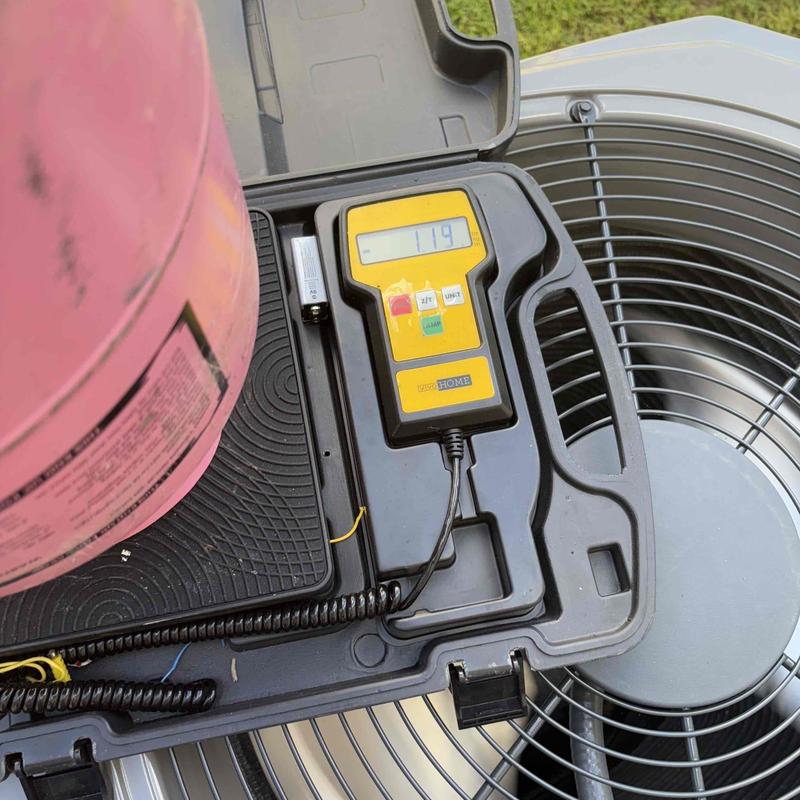 A technician in Locust Grove, VA completed a maintenance visit on an eight-month-old heat pump system. The unit was low on refrigerant, showing subcooling at 2.8°F. After adding 1.19 lbs of R-410A, subcooling reached the correct level of 10°F. The system now operates properly. A follow-up check is recommended in six months.