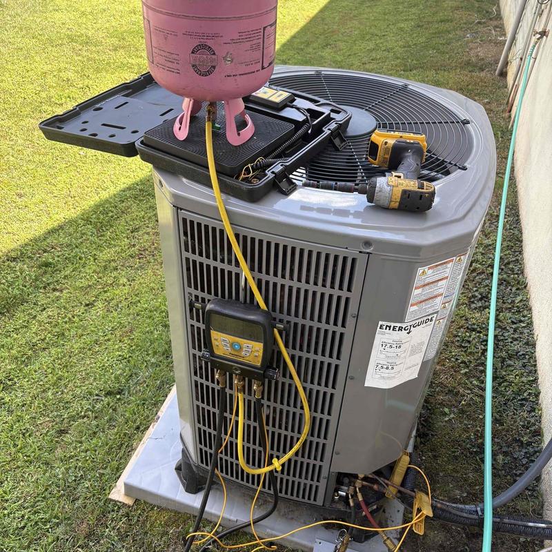 Technicians in Locust Grove, VA completed maintenance on two HVAC heat pump systems. They flushed drain lines, checked system functions, and inspected components. The upstairs unit showed low cooling performance due to low refrigerant. After a system recharge, both units resumed normal operation and met performance standards.