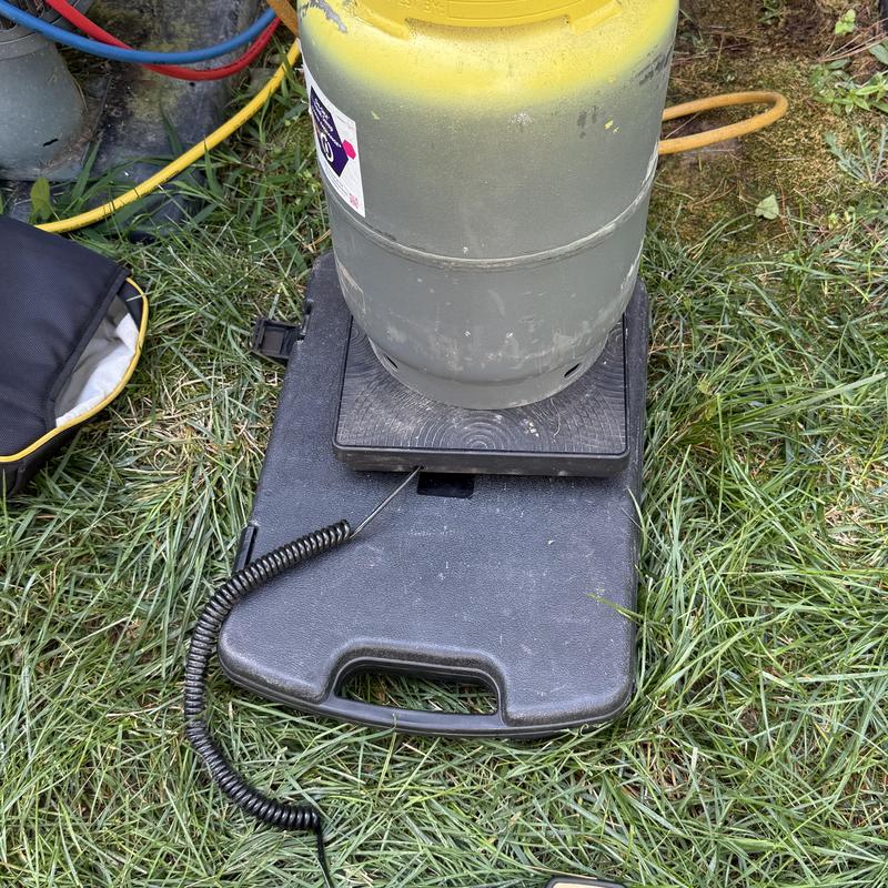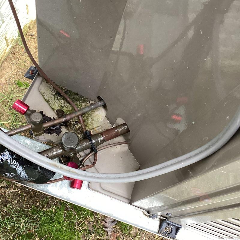 A technician performed a refrigerant recharge on a 10-year-old heat pump system in Stafford, VA. The system had frozen and required thawing before diagnostics. Water was drained from the pan, the air handler was cleared, and three pounds of R410a refrigerant were added without a warranty on the charge.