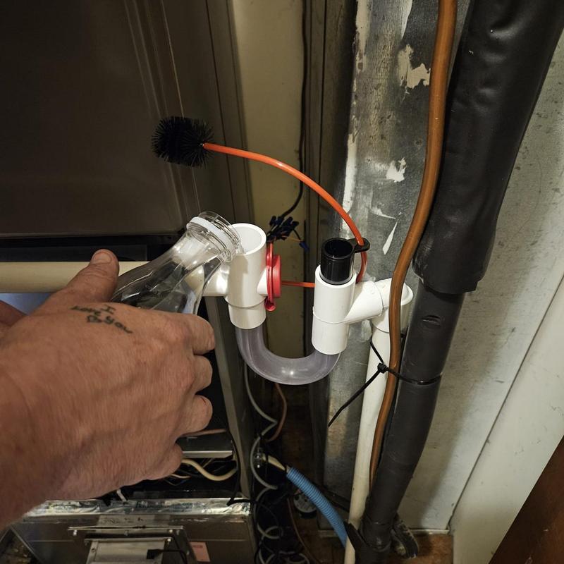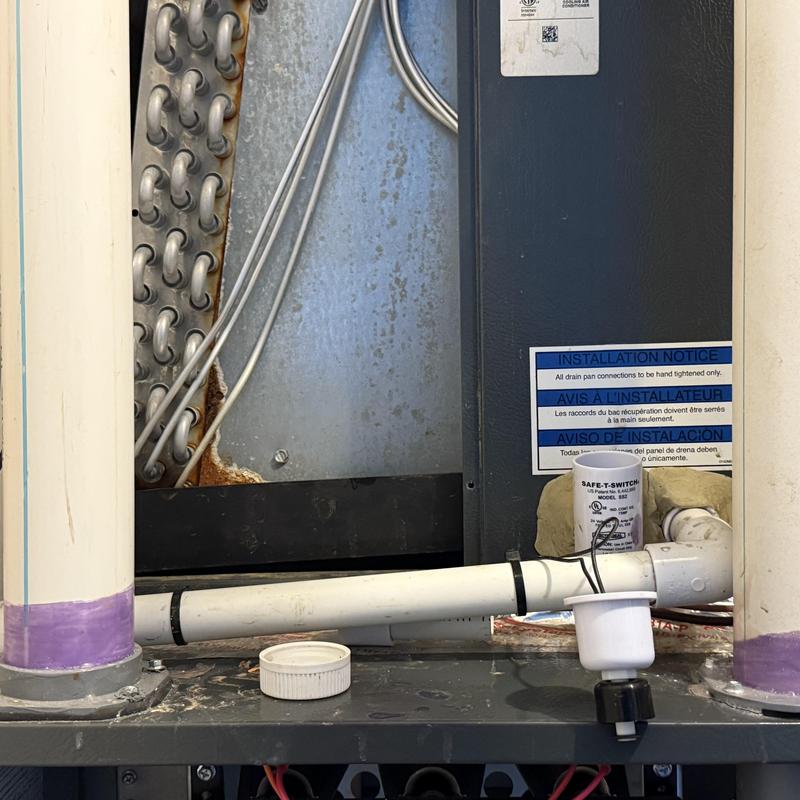 An HVAC technician in Stafford, Virginia responded to a basement leak caused by a clogged drain line. The service included clearing the blockage, installing two safety switches on the drain line and emergency pan, and testing system performance. The technician also recommended attic unit upgrades and provided a six-month limited warranty on the new components.