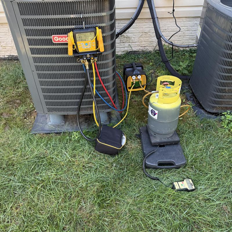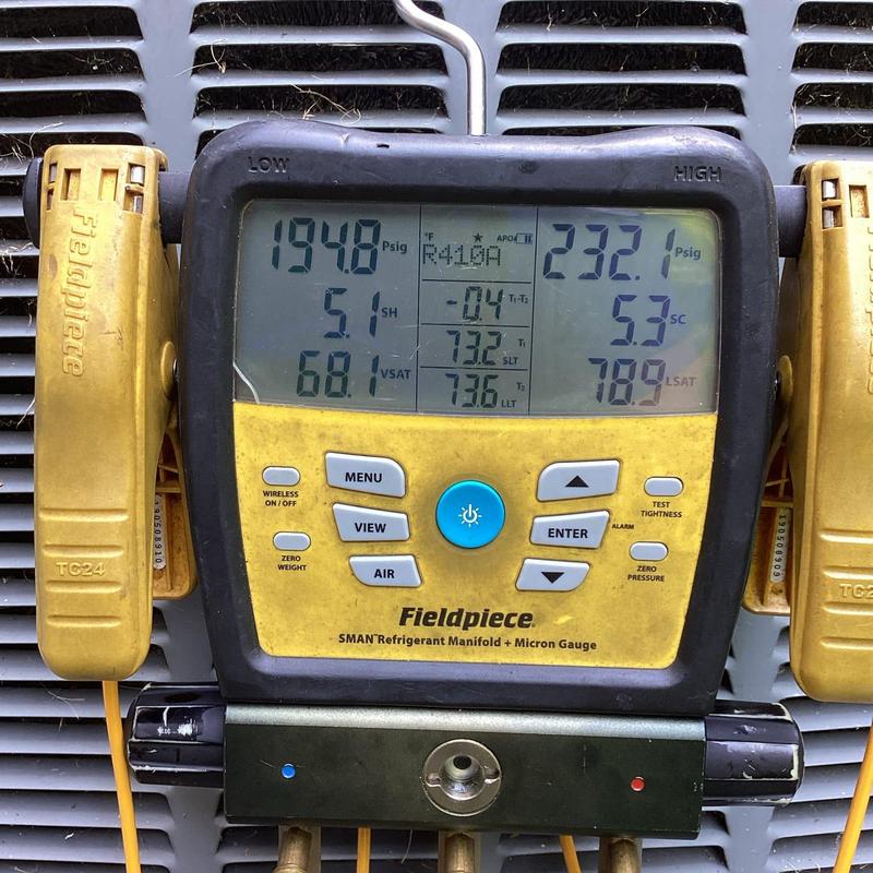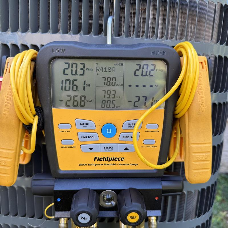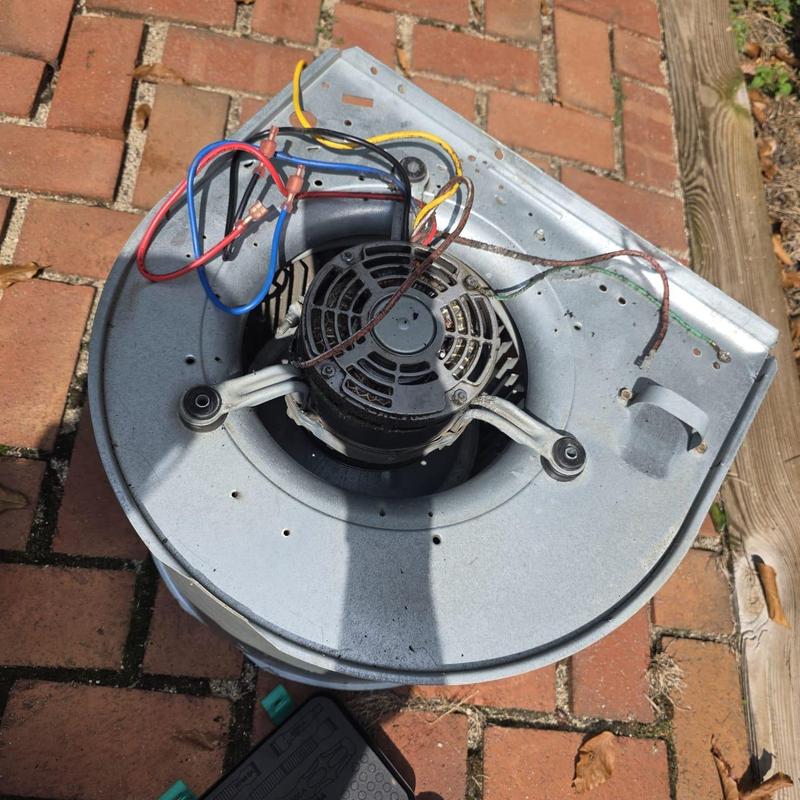 A technician in Fredericksburg, Virginia repaired a downstairs HVAC unit that was short cycling with no cooling. The work involved replacing the blower motor and adding three pounds of R-410A refrigerant. The system now functions correctly.