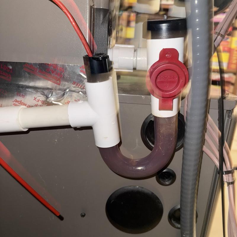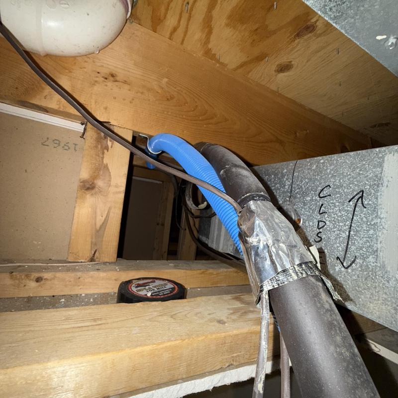A technician in Stafford, Virginia repaired a residential HVAC system with a blocked upstairs attic drain line. The team installed an EZ trap downstairs and separated the condensate lines to stop future backups. Both heating and cooling units were tested and are now operating normally.