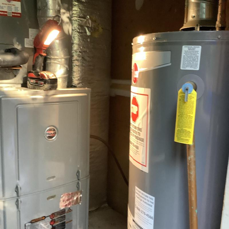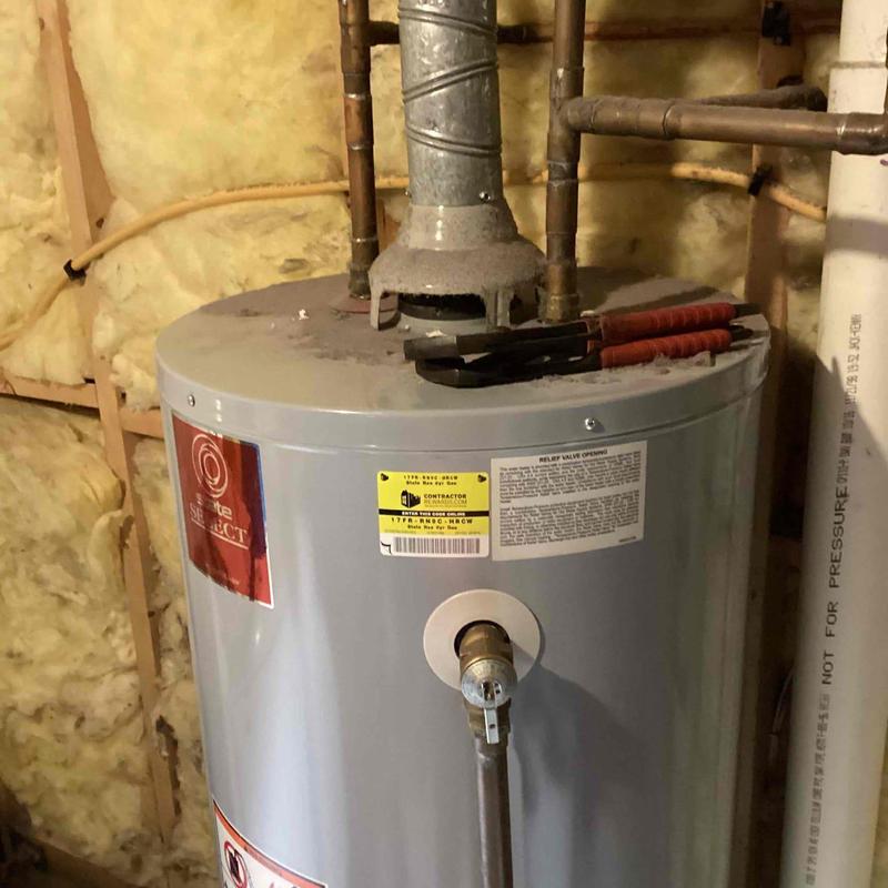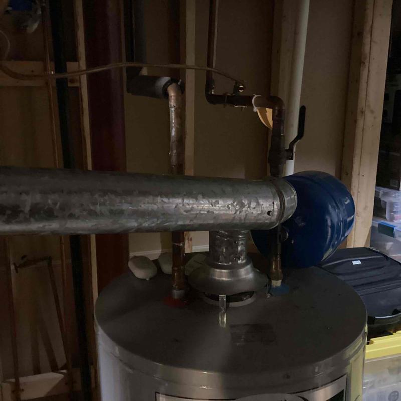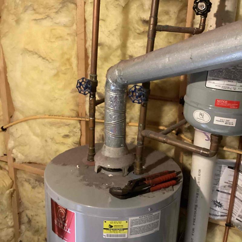 A technician in Stafford, VA removed an old water heater and installed a new 50-gallon atmospheric gas model. The work included adding an expansion tank, shut-off, and safety pan. They connected the water, gas, and flue lines, repositioned the unit for better efficiency, and verified the system operated without leaks.