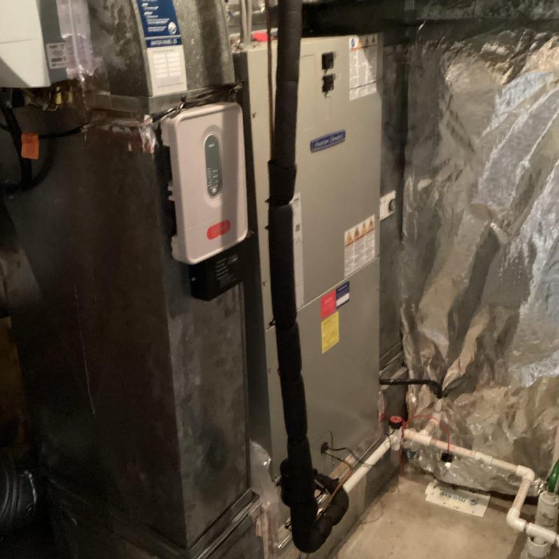 OHA HVAC Plumbing Chimney and Fireplaces installed a 3-ton American Standard split heat pump system with air handler, thermostat, and heat strip at a home in Arlington, VA. They later connected the humidifier by modifying the return trunk line, rerouting the waterline, and adding a drain. The existing humidifier control board required replacement.